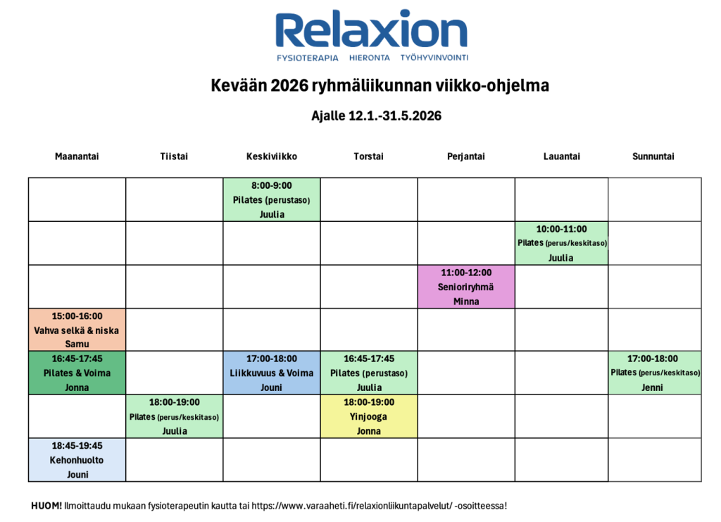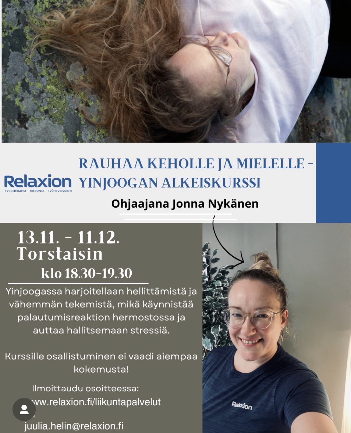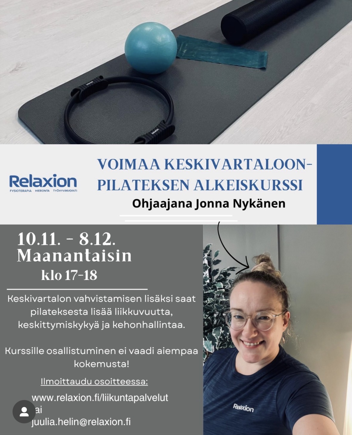 - Voit kysyä lisätietoa ryhmäliikunnasta vastaavalta ft:ltä: juulia.helin @relaxion.fi